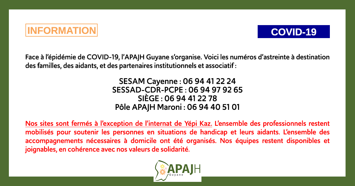 Face à l’épidémie de COVID-19 l’APAJH Guyane s’organise. Voici les numéros d’astreinte à destination des Familles, des aidants, et des partenaires institutionnels et associatifs :